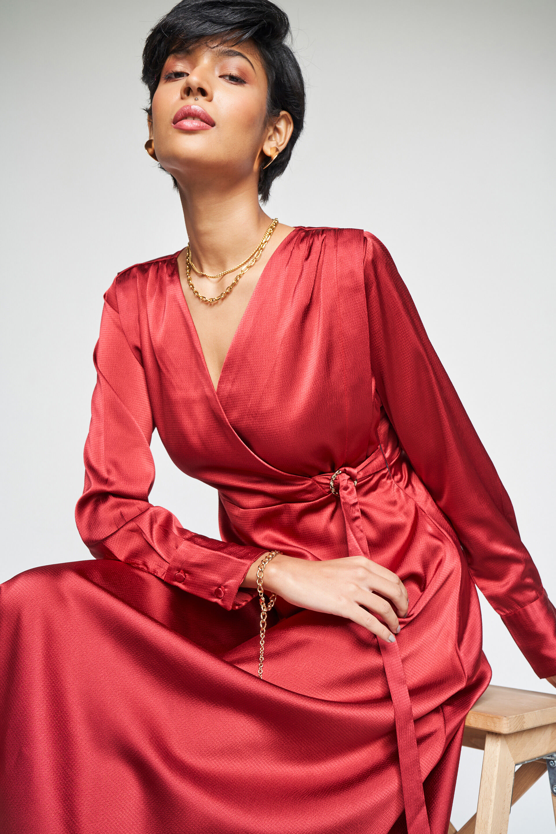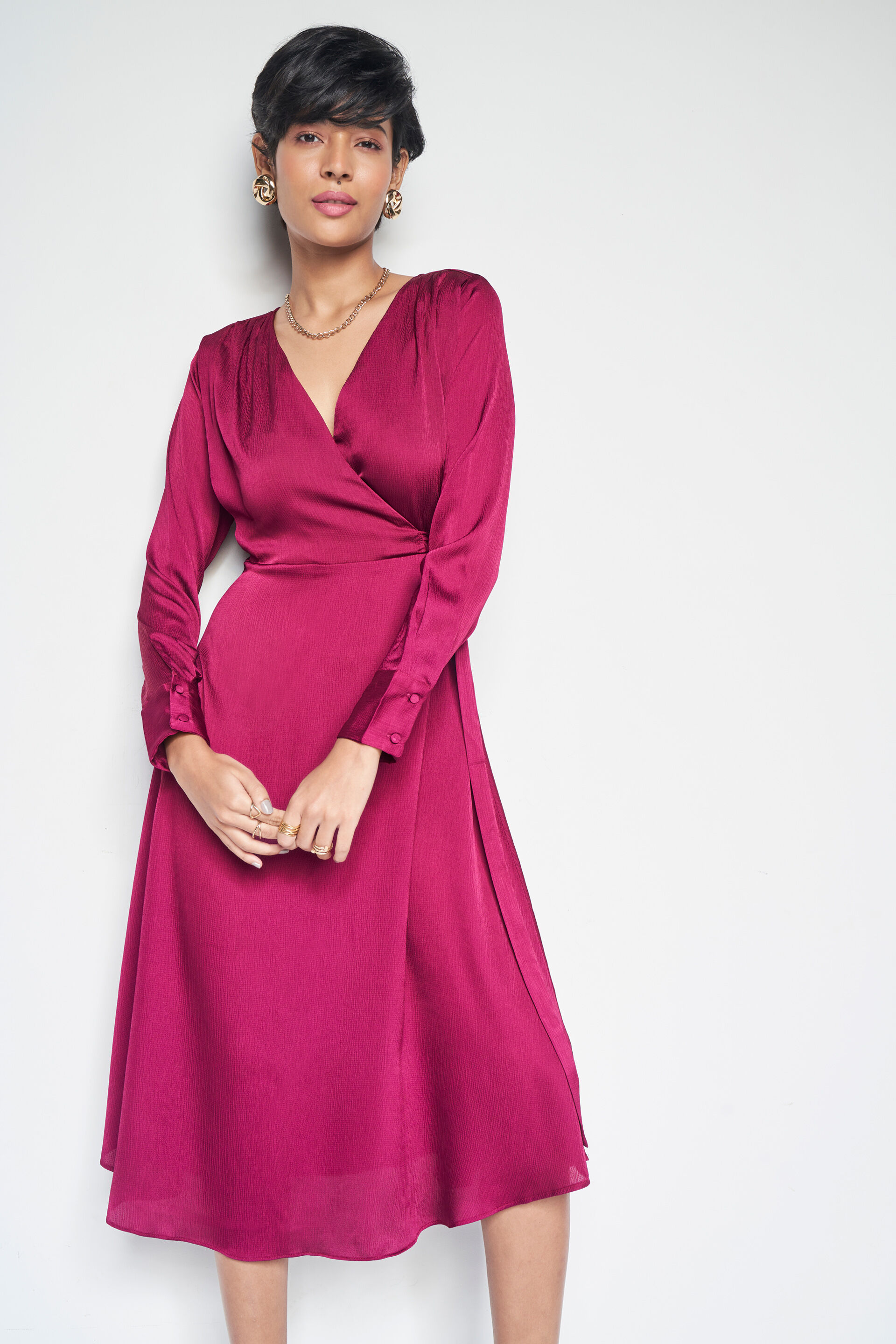 This classic dress features a V-neckline, crossover detailing at the front, and long sleeves. What we love about it is the flowy, flared silhouette- making it the perfect pick for formal gatherings.