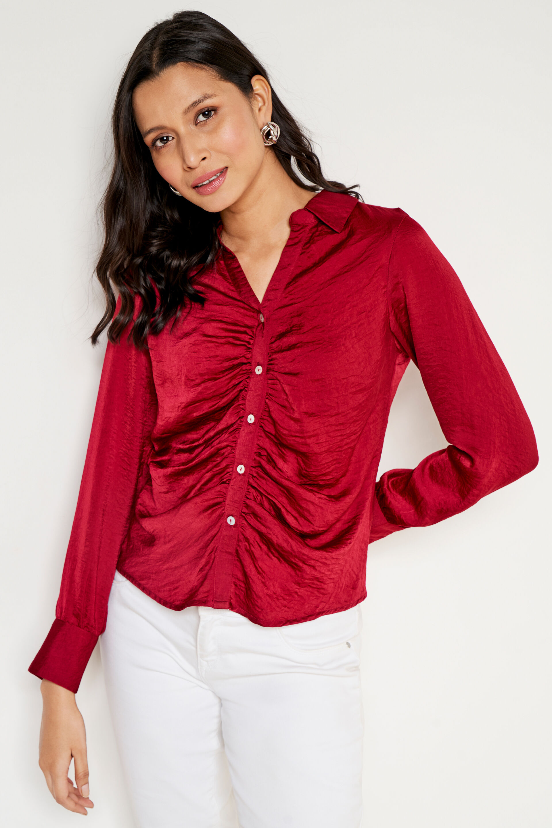 Look sophisticated and chic with this eminently stylish satin shirt for women from AND. Fashioned in a gorgeous navy blue shiny satin material featuring a ruched bodice with long sleeves. Stylise this shirt with white wide-leg jeans and complementing stone-studded earrings.